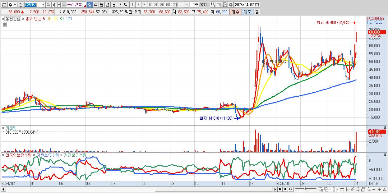 - 동신건설 (67,600원 ▲ 10.64% , 시총: 5,678억, 거래량: 2,786,509, 거래대금:1,887억)
