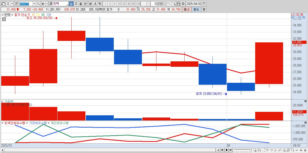- 한텍 (31,450원 ▲ 29.96% , 시총: 3,498억, 거래량: 11,261,551, 거래대금:3,252억)