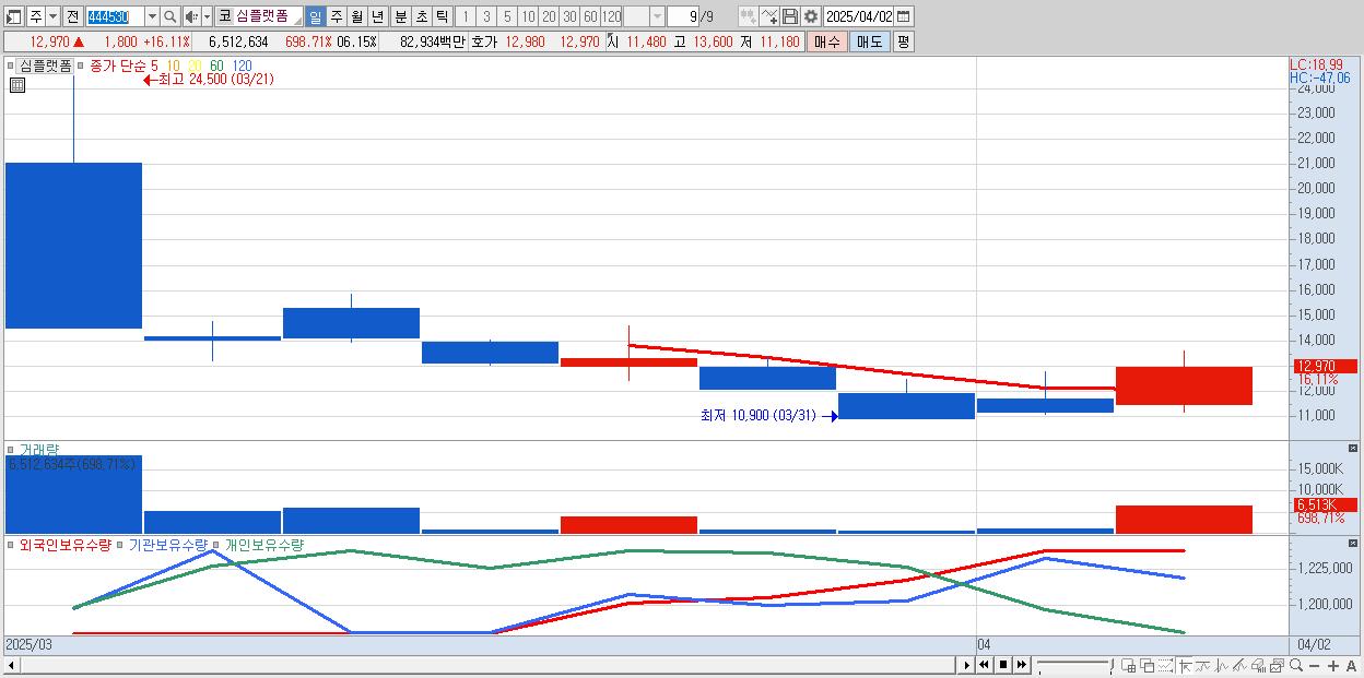- 심플랫폼 (12,970원 ▲ 16.11% , 시총: 796억, 거래량: 6,512,634, 거래대금:829억)