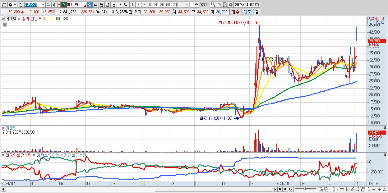 - 에이텍 (39,050원 ▲ 4.97% , 시총: 3,226억, 거래량: 4,625,608, 거래대금:1,843억)