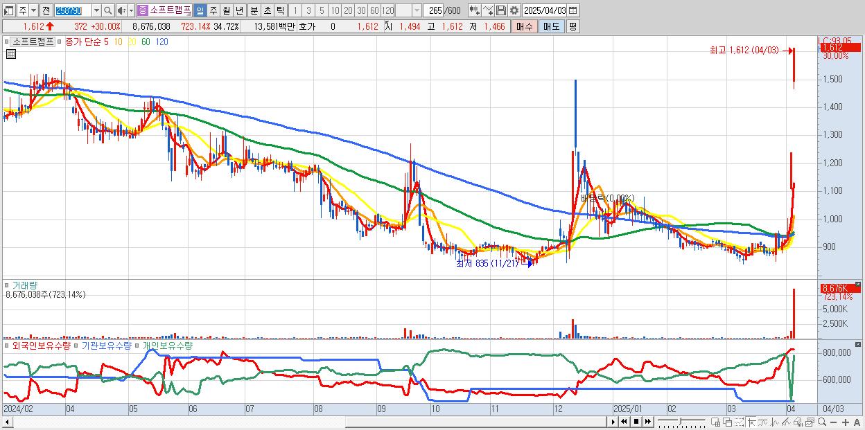 [서울=뉴시스]주동일 기자 = 윤석열 대통령의 탄핵심판 선고를 하루 앞두고 이재명 더불어민주당 대표의 테마주로 알려진 소프트캠프가 개장과 함께 상한가로 직행했다. 3일 한국거래소에 따르면 소프트웨어 개발기업 소프트캠프는 1612원으로 상한가를 기록했다. 소프트캠프는 전일(1240원) 대비 20.5% 오른 1494원에 상승출발한 뒤 상한가로 직행했다.…