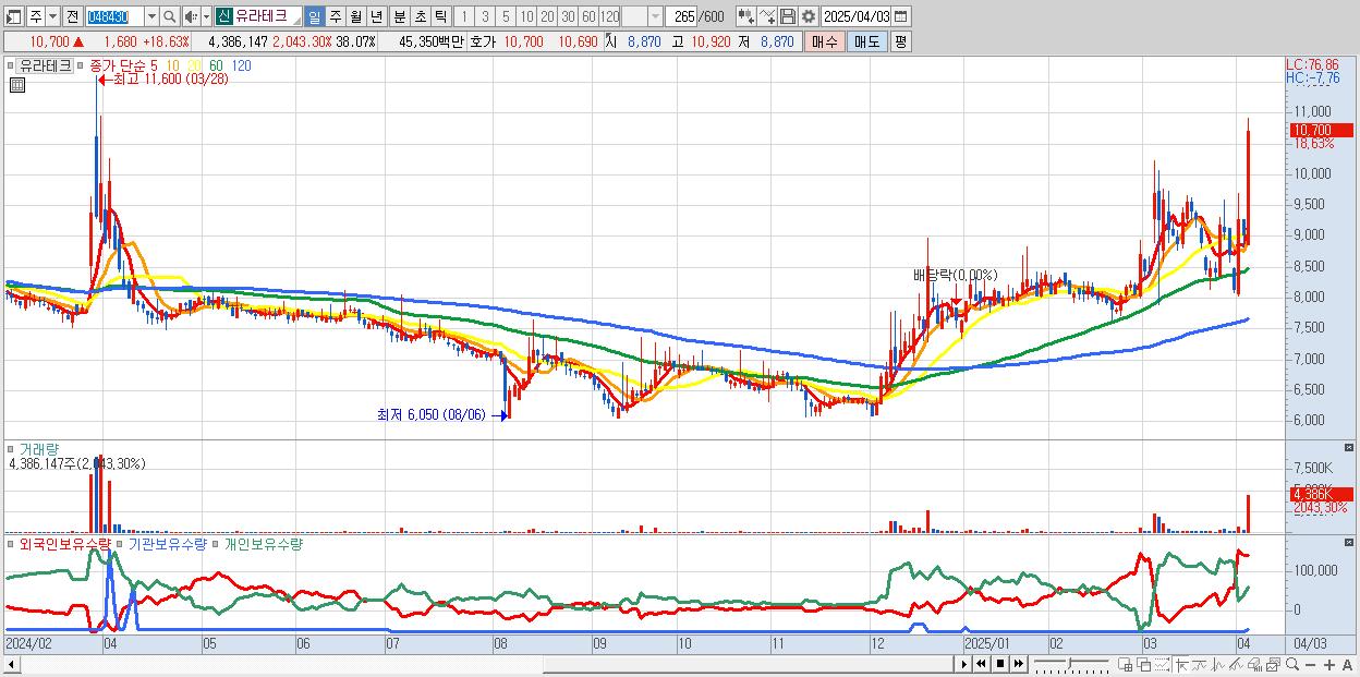 - 유라테크 (10,700원 ▲ 18.63% , 시총: 1,233억, 거래량: 4,386,147, 거래대금:454억)