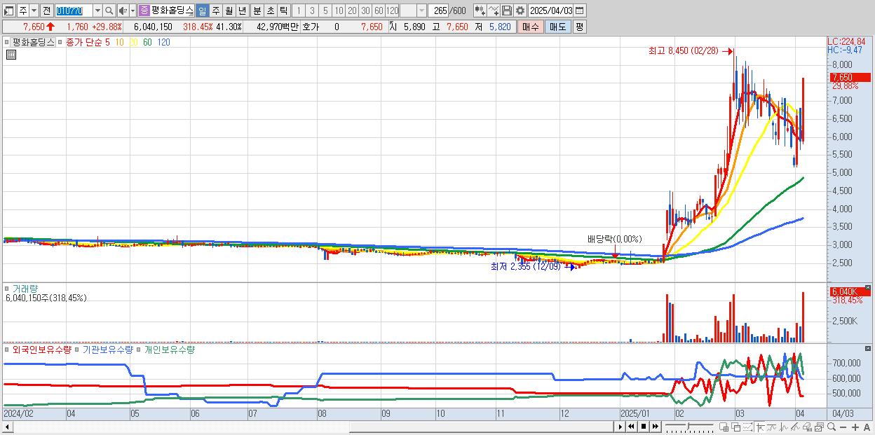- 평화홀딩스 (7,650원 ▲ 29.88% , 시총: 1,119억, 거래량: 6,040,150, 거래대금:430억)