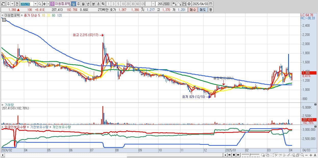 - 이원컴포텍 (1,366원 ▲ 8.41% , 시총: 428억, 거래량: 207,413, 거래대금:3억)