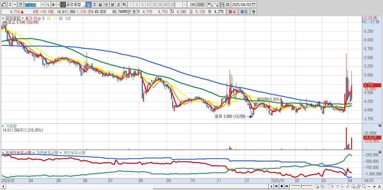- 금강공업 (4,710원 ▲ 10.18% , 시총: 1,381억, 거래량: 14,611,566, 거래대금:697억)