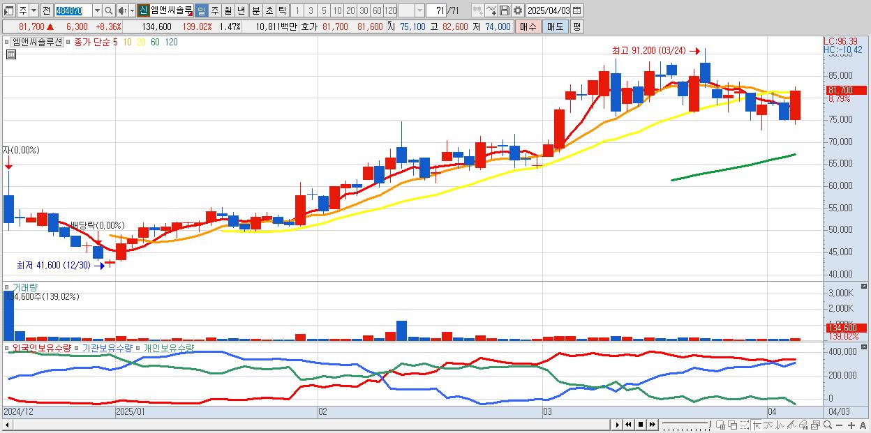 - 엠앤씨솔루션 (82,000원 ▲ 8.75% , 시총: 7,506억, 거래량: 109,817, 거래대금:88억)