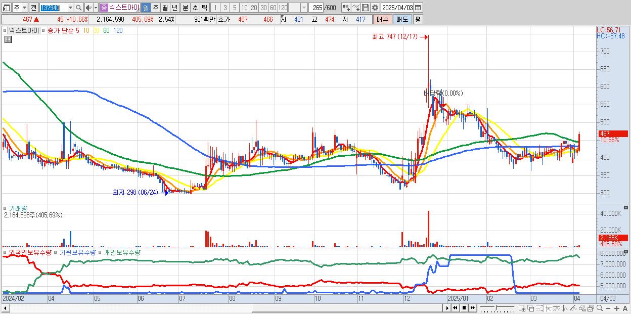 - 넥스트아이 (467원 ▲ 10.66% , 시총: 399억, 거래량: 2,164,598, 거래대금:10억)
