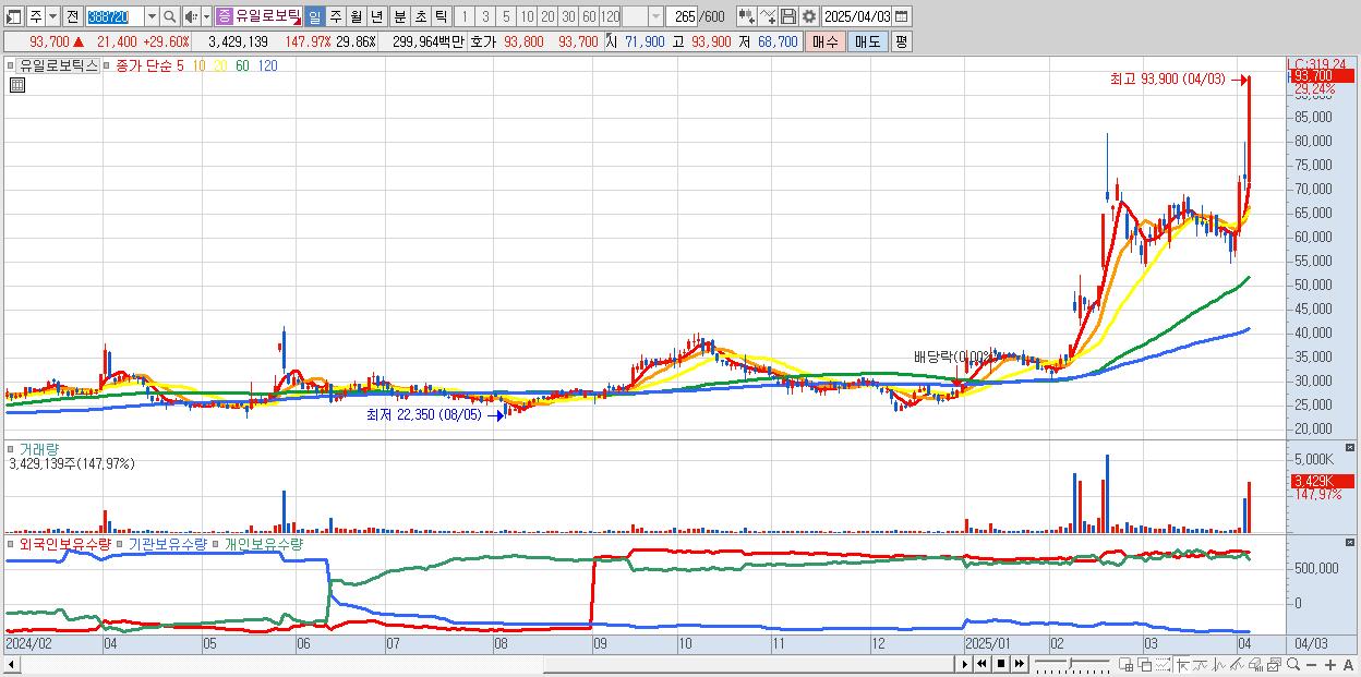 - 유일로보틱스 (92,600원 ▲ 28.08% , 시총: 10,633억, 거래량: 1,828,427, 거래대금:1,619억)
