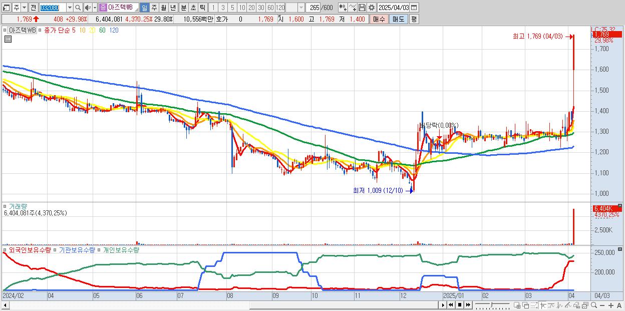 - 아즈텍WB (1,769원 ▲ 29.98% , 시총: 380억, 거래량: 6,404,081, 거래대금:106억)