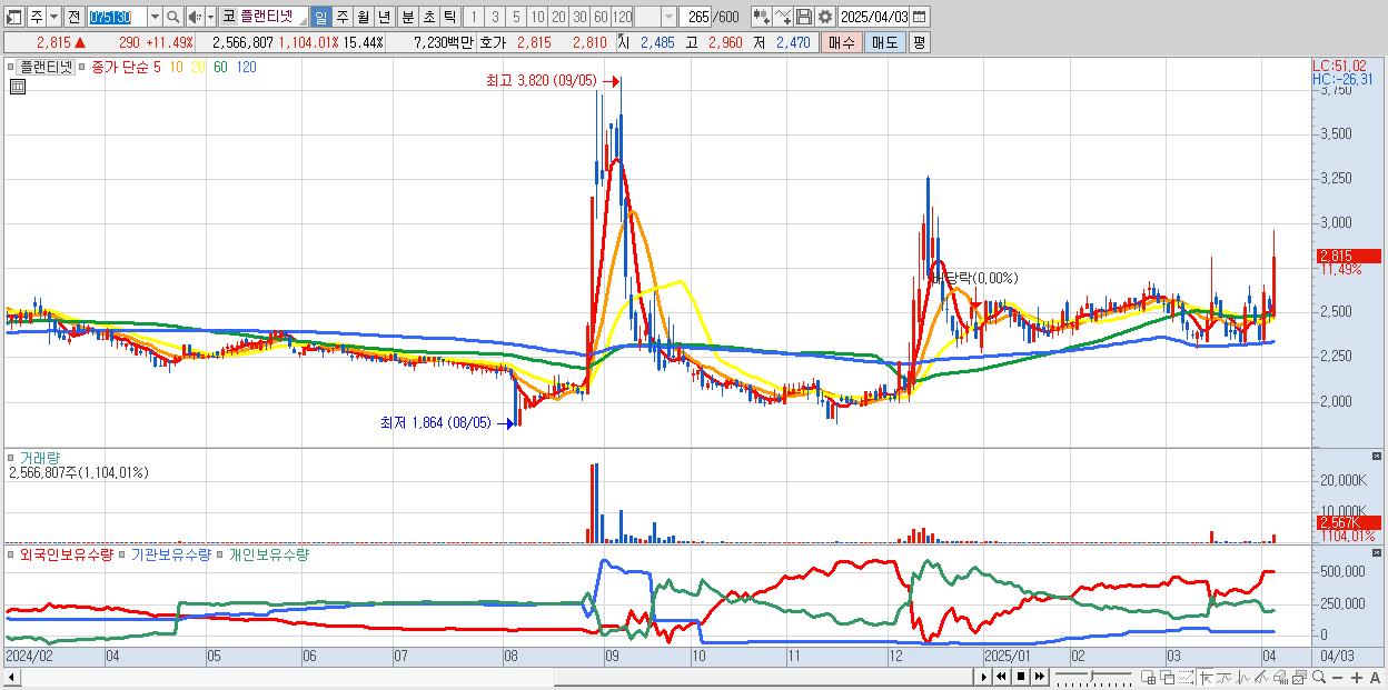 - 플랜티넷 (2,815원 ▲ 11.49% , 시총: 468억, 거래량: 2,566,807, 거래대금:72억)