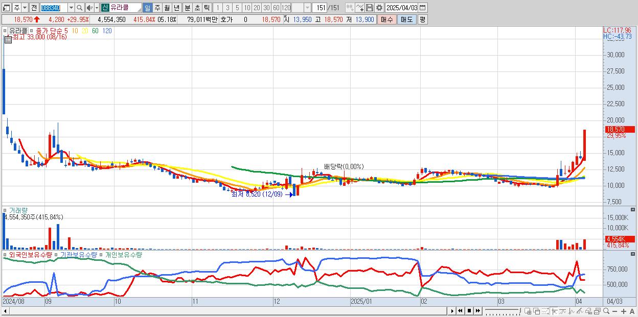 - 유라클 (18,570원 ▲ 29.95% , 시총: 804억, 거래량: 4,554,350, 거래대금:790억)