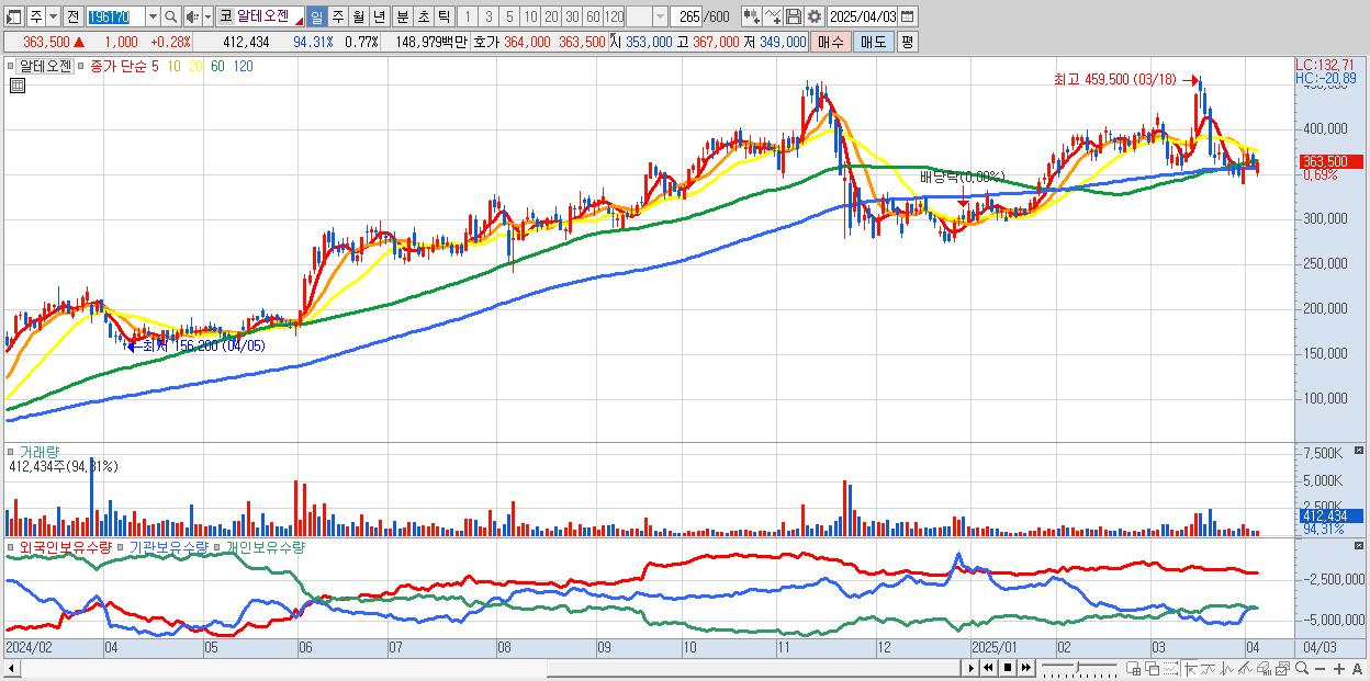 - 알테오젠 (365,000원 ▲ 0.69% , 시총: 194,614억, 외국인 순매수 거래금:59억)