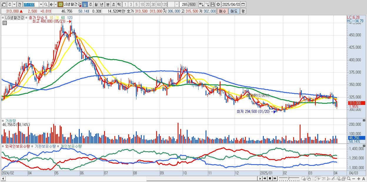 - LG생활건강 (315,000원 ▲ 1.45% , 시총: 49,197억, 외국인 순매수 거래금:54억)