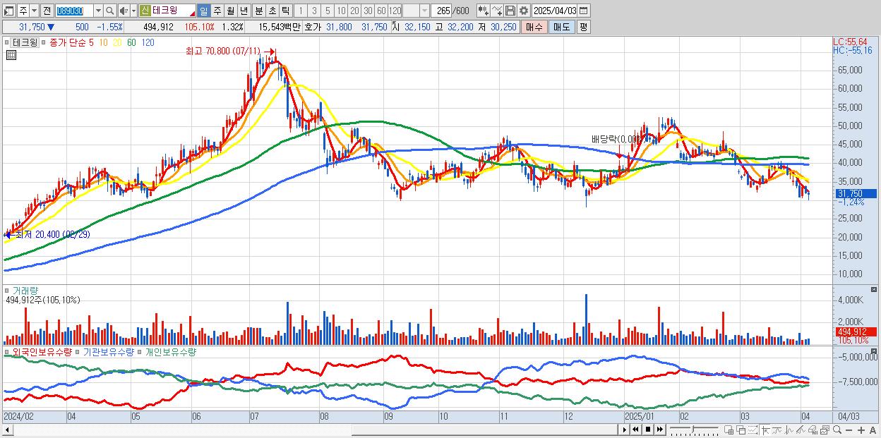 - 테크윙 (31,800원 ▼ -1.4% , 시총: 11,878억, 외국인 순매수 거래금:23억)