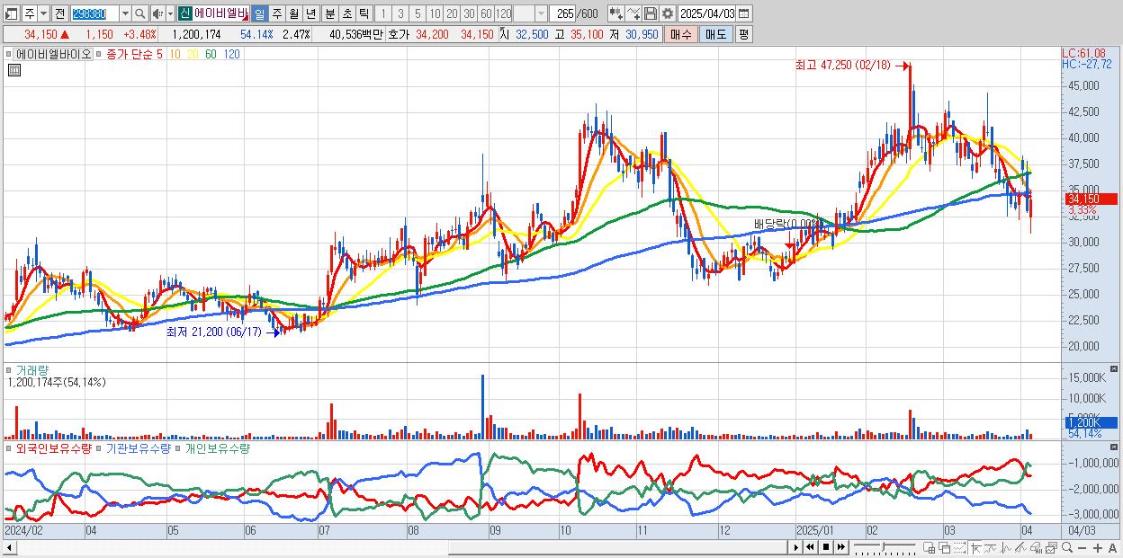 - 에이비엘바이오 (34,600원 ▲ 4.85% , 시총: 16,791억, 외국인 순매수 거래금:51억)