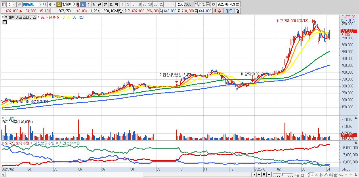 1.한화에어로스페이스 697,000원 ▲ 5.13% (KOSPI, 012450)