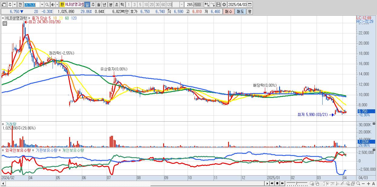 - HLB생명과학 (6,750원 ▼ -0.3% , 시총: 8,228억, 외국인 순매수 거래금:17억)