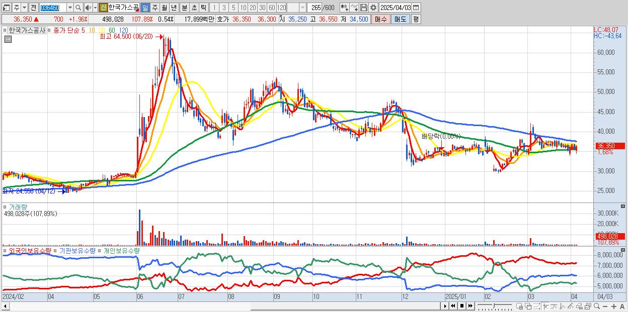 - 한국가스공사 (36,300원 ▲ 1.82% , 시총: 33,510억, 외국인 순매수 거래금:26억)