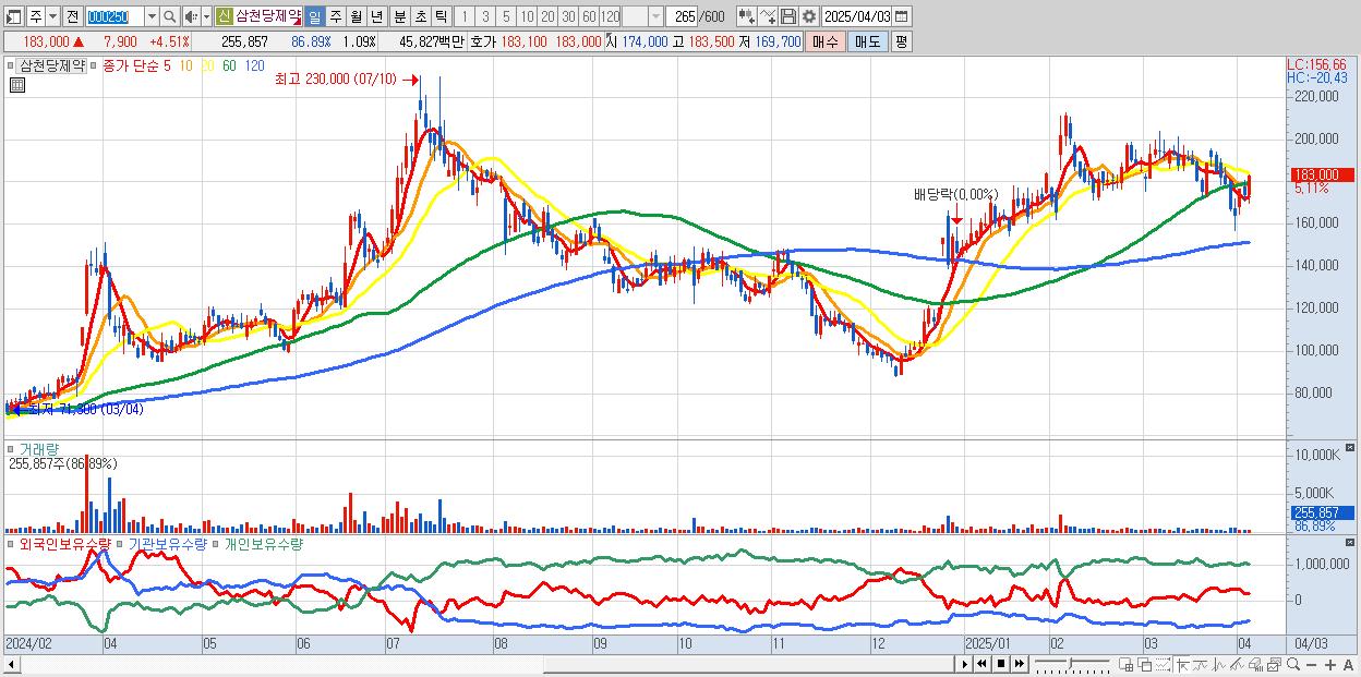 - 삼천당제약 (183,400원 ▲ 4.74% , 시총: 43,021억, 외국인 순매수 거래금:20억)