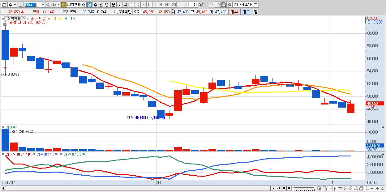 - LG씨엔에스 (48,850원 ▲ 1.14% , 시총: 47,329억, 외국인 순매수 거래금:18억)