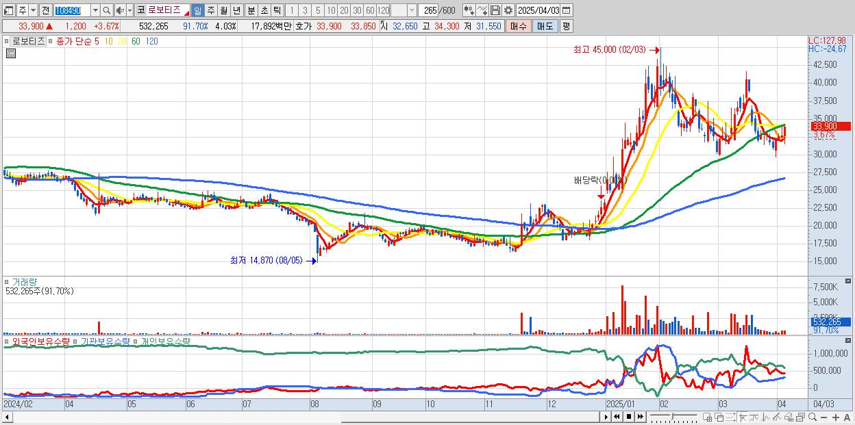 - 로보티즈 (33,750원 ▲ 3.21% , 시총: 4,458억, 외국인 순매수 거래금:18억)