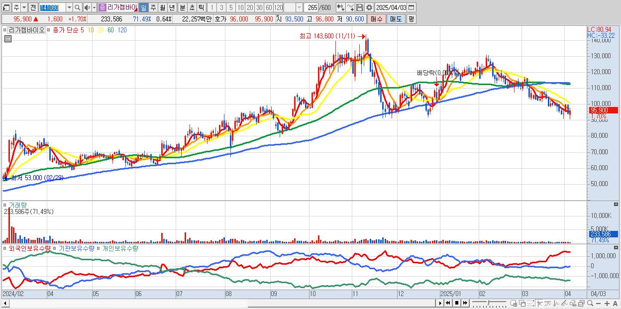 - 리가켐바이오 (96,200원 ▲ 2.01% , 시총: 35,219억, 외국인 순매수 거래금:23억)