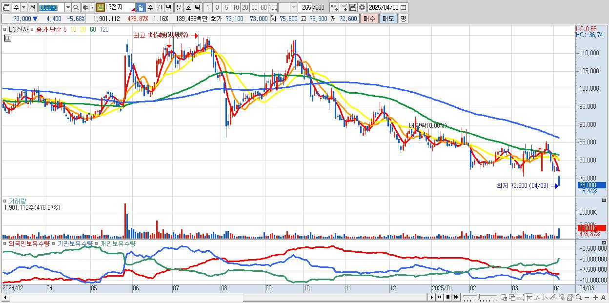 - LG전자 (72,900원 ▼ -5.81% , 시총: 119,299억, 거래량: 1,574,127, 거래대금:1,154억)