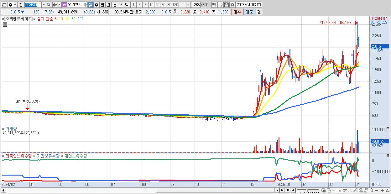 - 오리엔트바이오 (2,015원 ▼ -7.36% , 시총: 2,389억, 거래량: 49,011,899, 거래대금:1,095억)