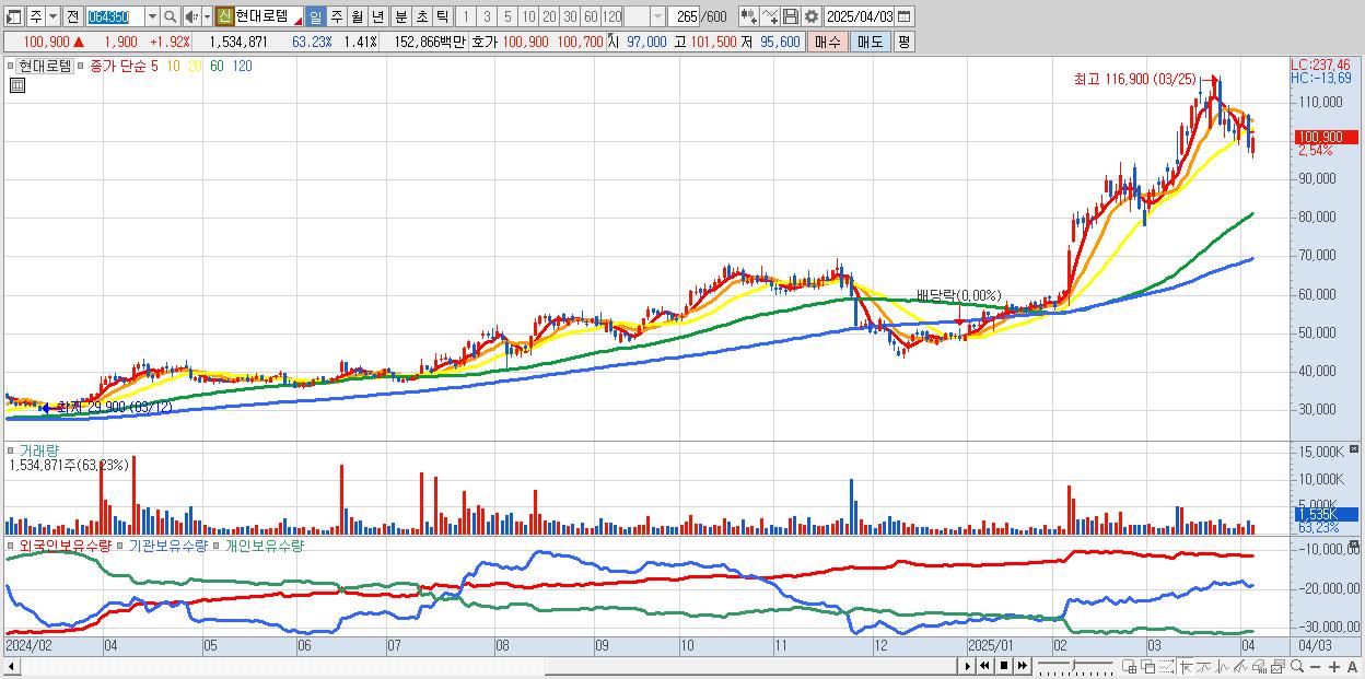 - 현대로템 (100,700원 ▲ 1.72% , 시총: 109,906억, 거래량: 1,176,346, 거래대금:1,172억)