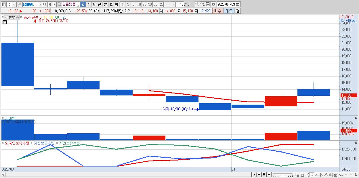 - 심플랫폼 (13,100원 ▲ 1% , 시총: 804억, 거래량: 8,369,016, 거래대금:1,177억)