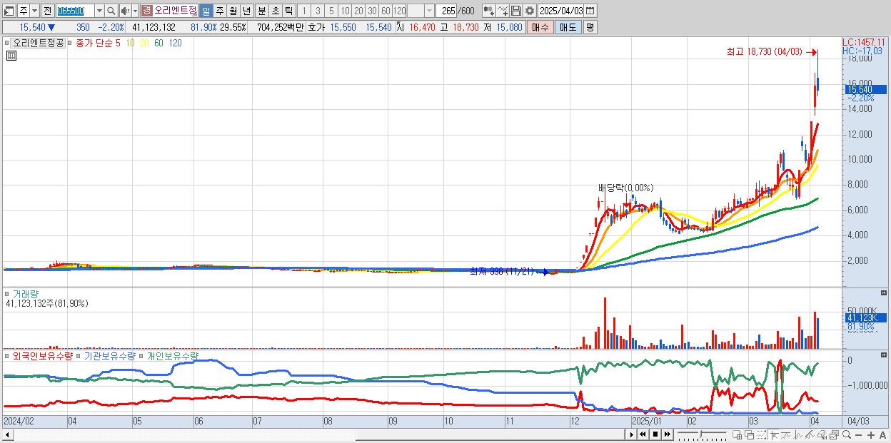 - 오리엔트정공 (15,540원 ▼ -2.2% , 시총: 4,933억, 거래량: 41,123,132, 거래대금:7,043억)