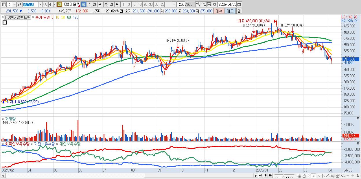 - HD현대일렉트릭 (292,500원 ▼ -0.51% , 시총: 105,438억, 거래량: 385,245, 거래대금:1,097억)
