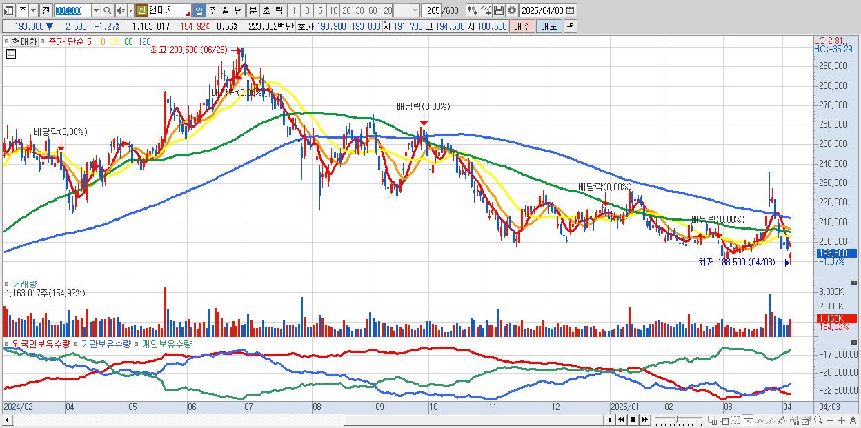 - 현대차 (193,800원 ▼ -1.27% , 시총: 405,849억, 거래량: 954,824, 거래대금:1,838억)