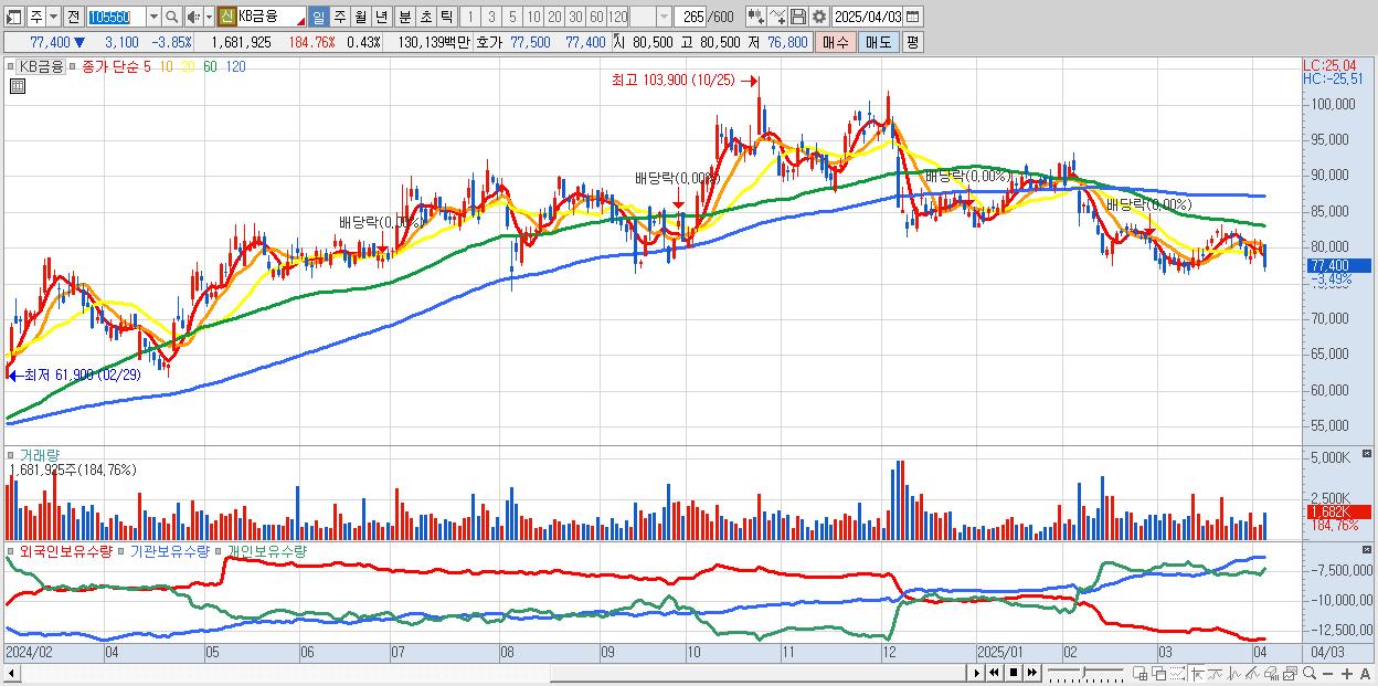 - KB금융 (77,100원 ▼ -4.22% , 시총: 303,410억, 거래량: 1,550,963, 거래대금:1,200억)