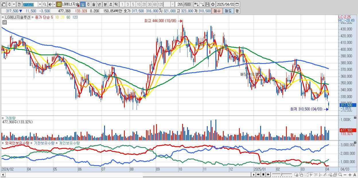 - LG에너지솔루션 (315,000원 ▼ -4.26% , 시총: 737,100억, 거래량: 388,422, 거래대금:1,227억)