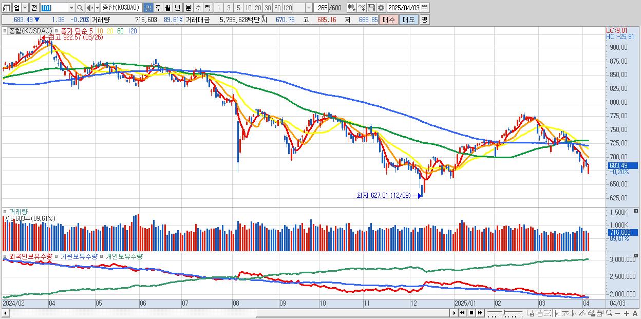 | 04/03 | 683.49 | ▼-0.20% | 665억 | -642억 | 37억 | -60억 |