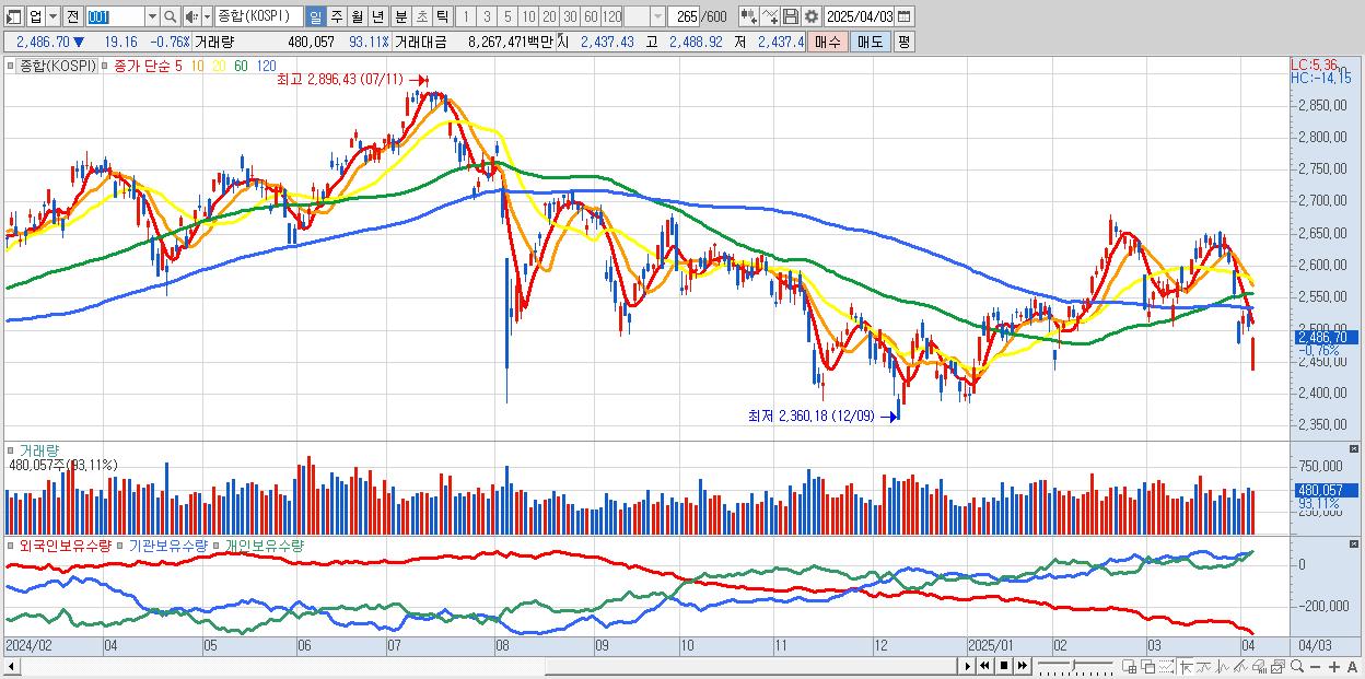 | 04/02 | 2,505.86 | ▼-0.62% | 4,791억 | -7,242억 | 1,480억 | 970억 |