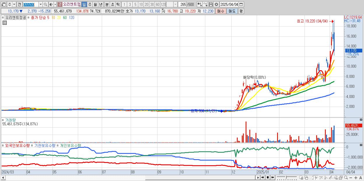- 오리엔트정공 (13,170원 ▼ -15.25% , 시총: 4,181억, 거래량: 55,461,679, 거래대금:8,700억)