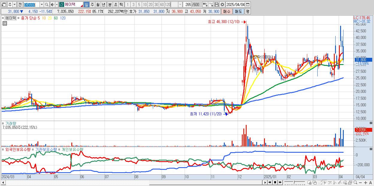 - 에이텍 (32,150원 ▼ -10.57% , 시총: 2,656억, 거래량: 4,313,503, 거래대금:1,605억)