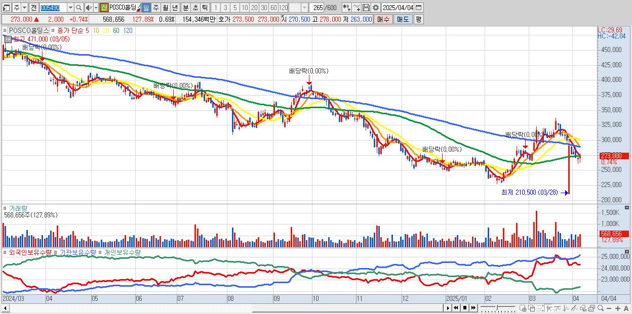 - POSCO홀딩스 (273,000원 ▲ 0.74% , 시총: 225,565억, 거래량: 461,911, 거래대금:1,254억)