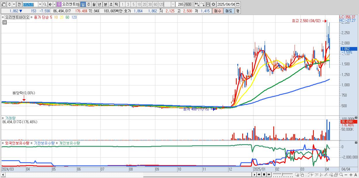 - 오리엔트바이오 (1,862원 ▼ -7.59% , 시총: 2,208억, 거래량: 86,494,017, 거래대금:1,837억)