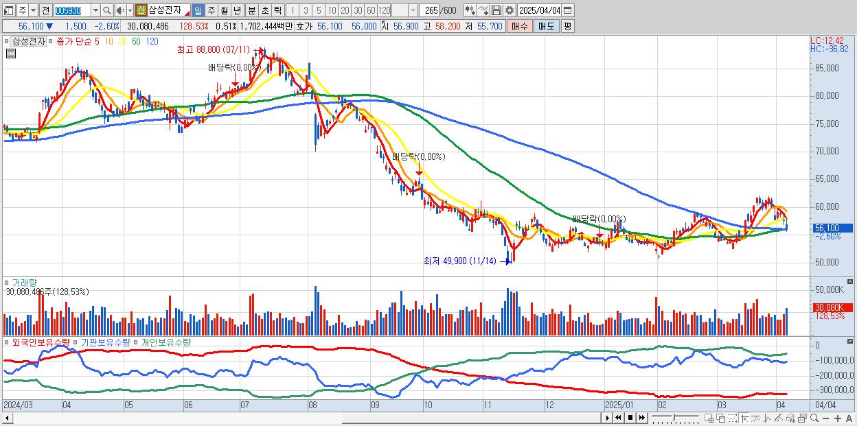2.삼성전자 56,100원 ▼ -2.6% (KOSPI, 005930)
