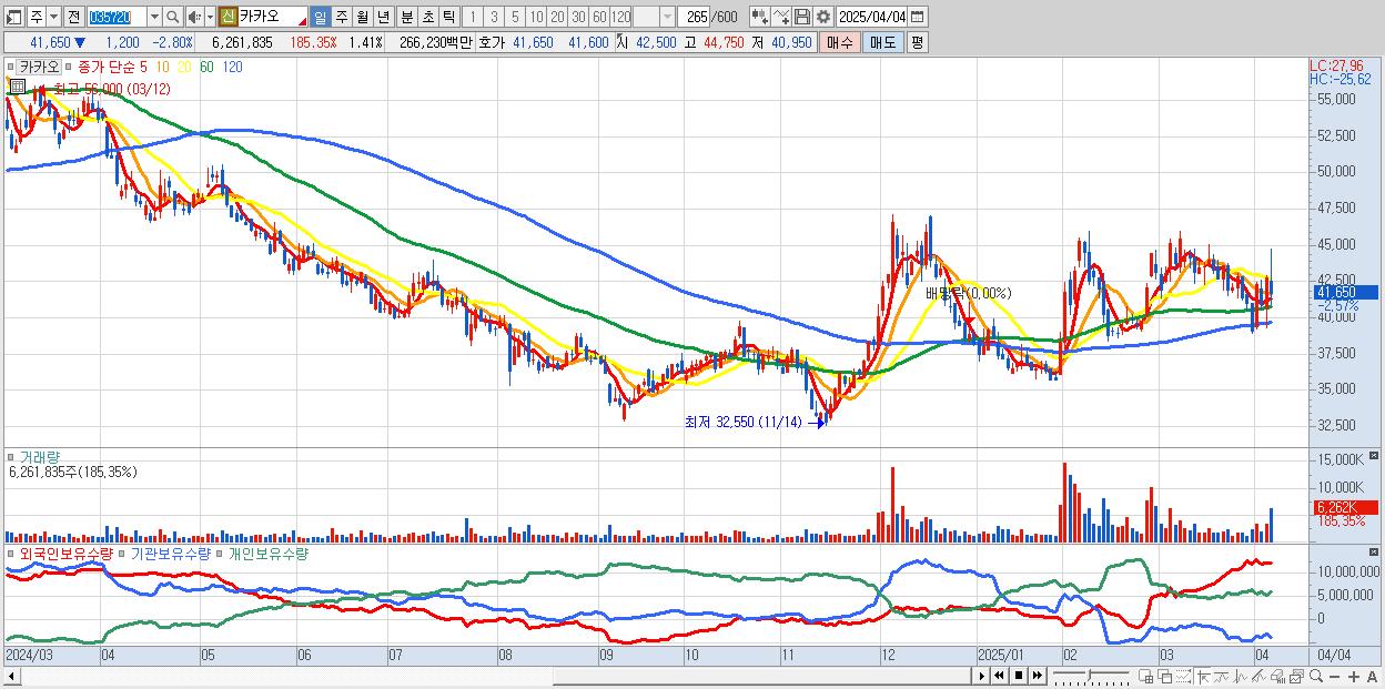 - 카카오 (41,850원 ▼ -2.33% , 시총: 185,697억, 거래량: 4,844,975, 거래대금:2,059억)