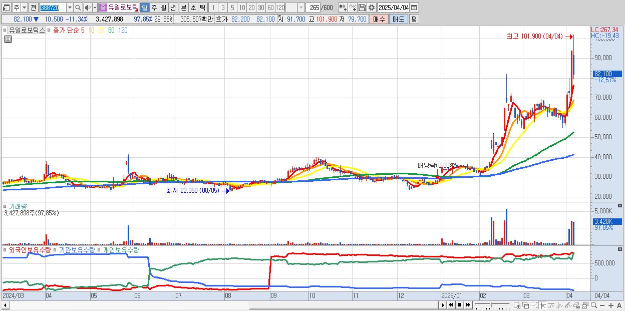 - 유일로보틱스 (83,100원 ▼ -10.26% , 시총: 9,542억, 거래량: 1,731,471, 거래대금:1,519억)