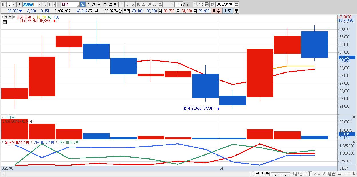- 한텍 (30,350원 ▼ -8.45% , 시총: 3,375억, 거래량: 3,907,987, 거래대금:1,270억)