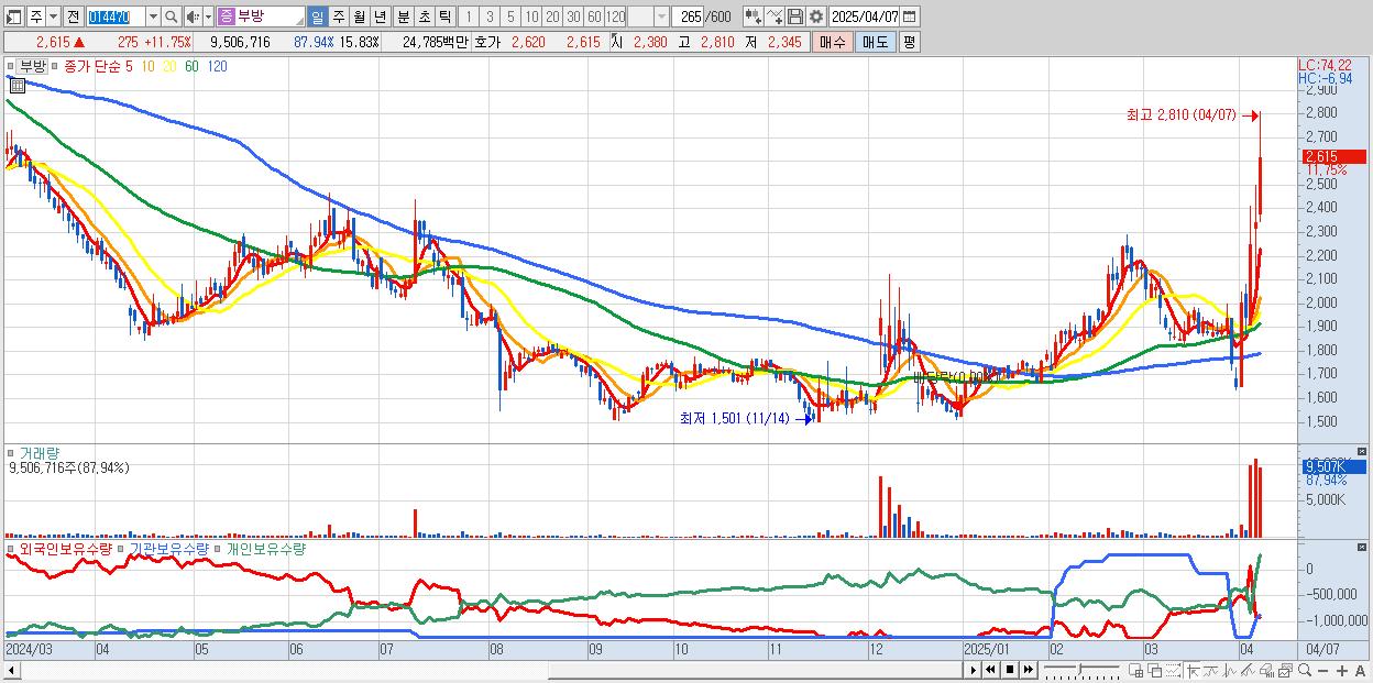 - 부방 (2,615원 ▲ 11.75% , 시총: 1,570억, 거래량: 9,506,716, 거래대금:248억, KOSDAQ)