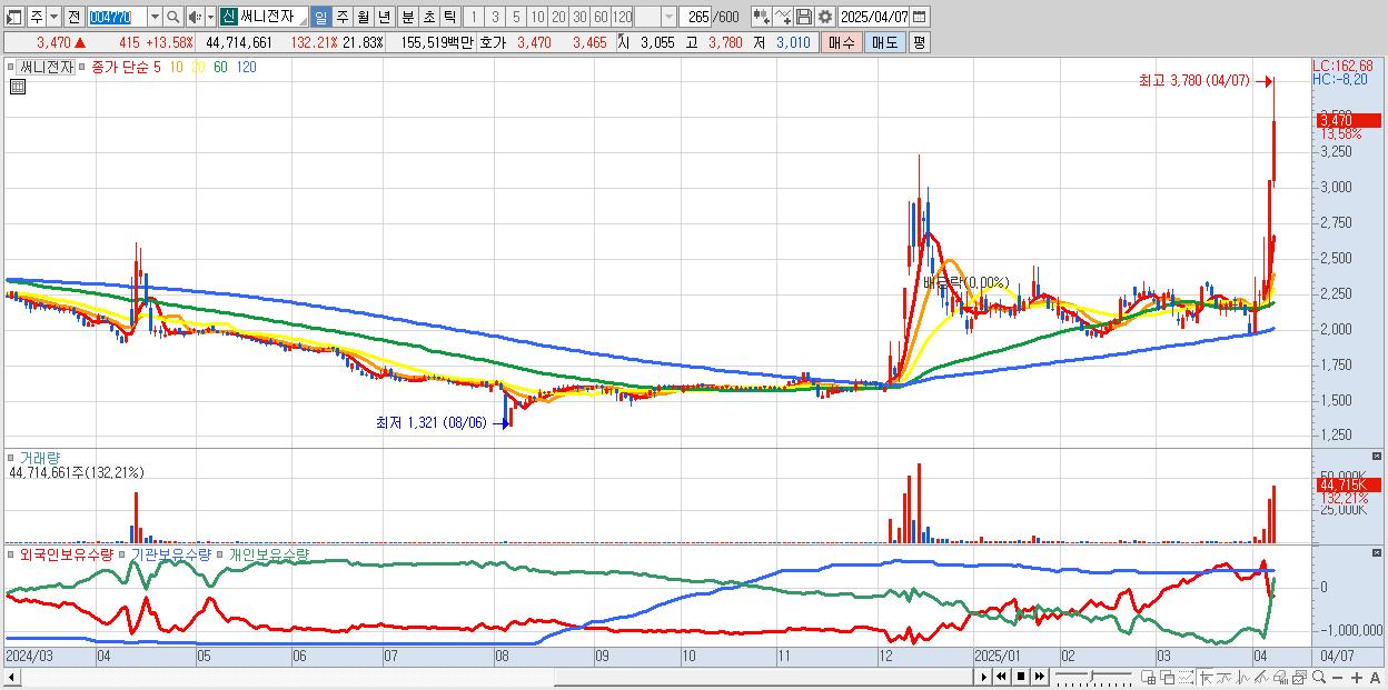 - 써니전자 (3,470원 ▲ 13.58% , 시총: 1,274억, 거래량: 44,714,661, 거래대금:1,555억, KOSPI)