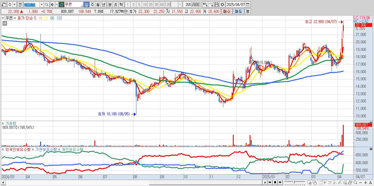 - 쿠콘 (22,300원 ▲ 8.78% , 시총: 2,287억, 거래량: 809,087, 거래대금:179억, KOSDAQ)
