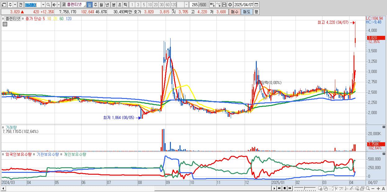 - 플랜티넷 (3,820원 ▲ 12.35% , 시총: 635억, 거래량: 7,758,170, 거래대금:305억, KOSDAQ)