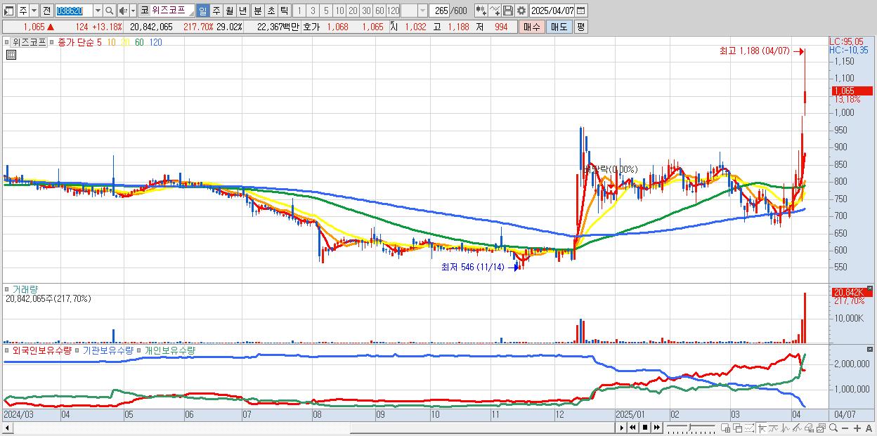- 위즈코프 (1,065원 ▲ 13.18% , 시총: 765억, 거래량: 20,842,065, 거래대금:224억, KOSDAQ)